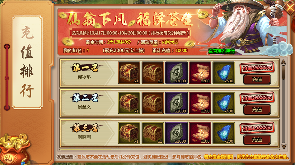 建议不要再最后几分钟充值,避免出现延迟影响排名,活动结束后,排行榜上玩家依据排名领取对应礼包。