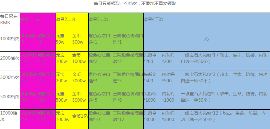举例:小明单日累计充值4000元,只可选择领取3000档次奖励,对应颜色道具均选择一个:神域陨铁*15、元宝200W、橙色心法自选*3、头衔令*1000