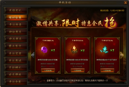 活动期间,每天会随机刷新一批特价道具,花费少量元宝即可购买,每个道具均有每天最大个人购买次数限制,部分道具有购买vip等级限制,买到就是赚到,机会不容错过!