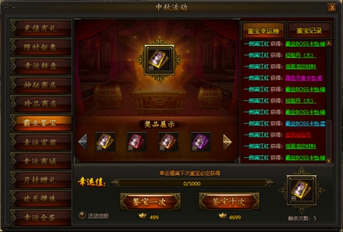 活动期间,花费一定数量元宝即可进行霸业鉴宝,每次鉴宝均可获得祝福值,祝福值满后下一次鉴宝必出极品大奖,数量有限,不容错过。