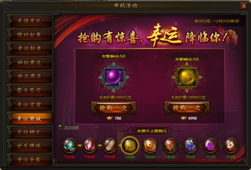 活动期间,每隔一段时间,商城限时上架一批新道具(全服限量),每轮每个角色有最大购买次数,折扣多多,不容错过。