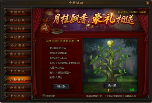 活动期间,每日完成任务可浇灌桂树,浇灌后桂树会按顺序开花,玩家可获得对应月桂赠礼礼包,更可获得高级节日称号。同时还有限时可购的花好月圆礼包,开启可获得超值材料奖励。
