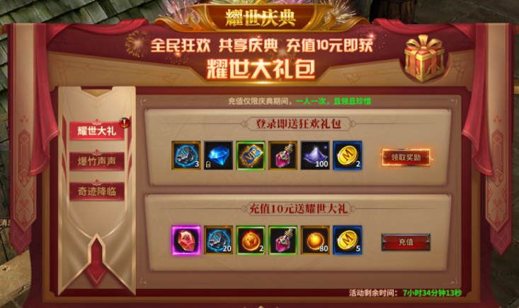 (1)在耀世庆典当天,登录即送狂欢礼包,狂欢礼包只限当天登录领取,各位奇迹守护者前往不要错过哦!
