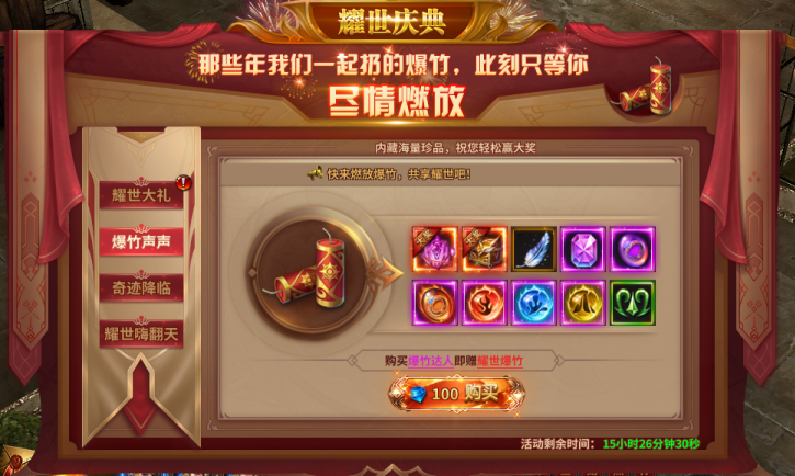 (1)耀世庆典当天,可以花费100钻购买爆竹达人称号,购买即可获赠耀世爆竹;