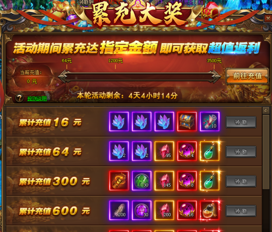每轮活动期间,累计充值达指定金额即可领取丰厚大奖;