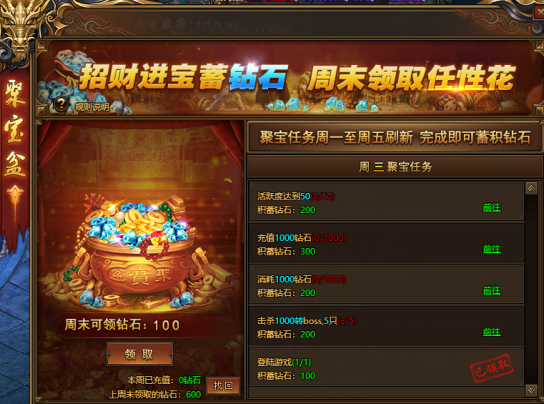 周一至周五每天完成相应任务即可为聚宝盆积蓄钻石,周末即可领取;