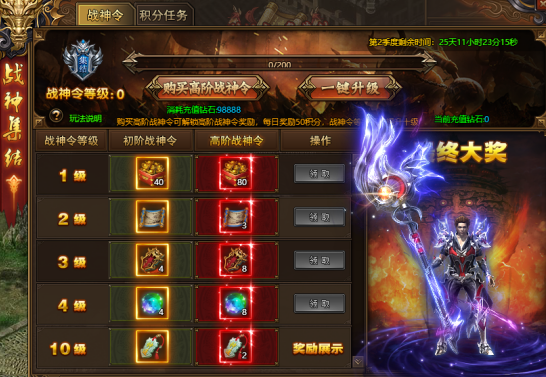 购买二期高阶战神令可解锁高阶战神令奖励、开放每日任务,战神令等级直接提升十级;