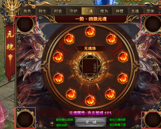 每一页四件魂玉都强化到指定等级还可获得对应元魂珠属性的百分比加成;