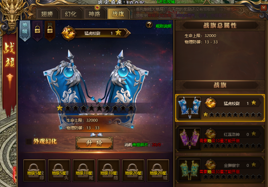 通过战旗升阶获得大量基础属性和新的特殊属性,还可解锁炫酷外形;