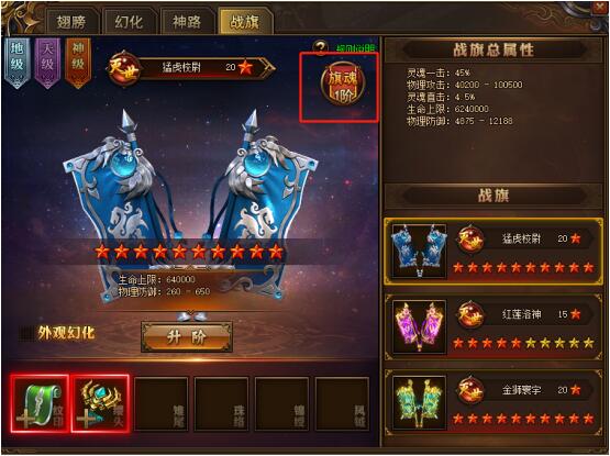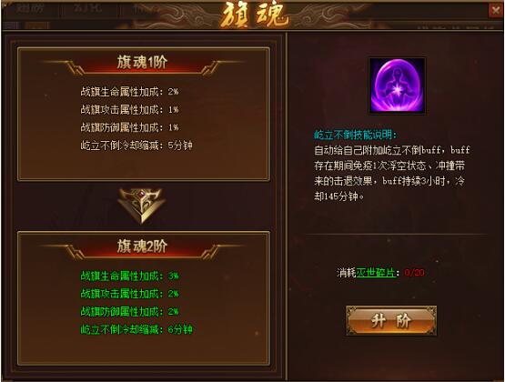 旗魂升阶可以百分比提升战旗属性,仅包括生命、攻击和防御,还能缩减【屹立不倒】的冷却时间;