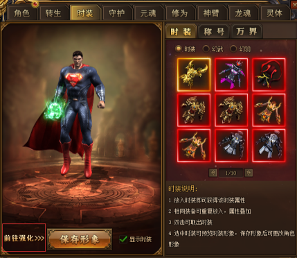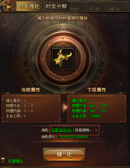 分解时装可获得强化道具去强化其它时装,可获得更多属性;