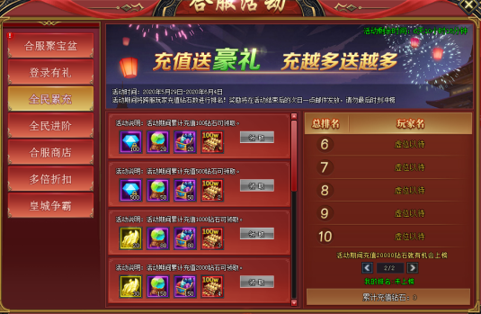 活动期间每日充值一定数量钻石即可领取超值大礼包,并且每日会按充值钻石数进行排名,排名奖励将在23:55通过邮件形式发放!