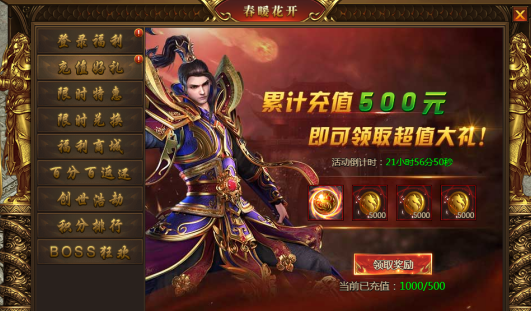 1.活动期间充值可在活动页面领取与充值金额等值的传奇币奖励