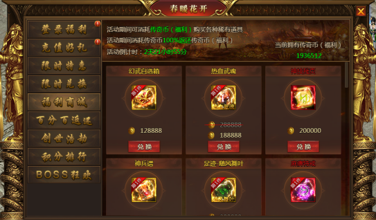 活动内容:活动期间可消耗传奇币(福利)购买稀有道具,消耗传奇币100%返还传奇币(福利)