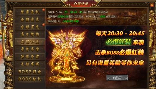 合服1-7天每天20:30-20.45分可进入必爆红装副本,副本里有3只红装BOSS,击杀后必定掉落红装
