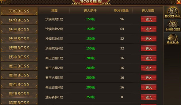 2. Boss也分等级,从天妖boss到鸿蒙boss,boss的战力会直线上升,稀有掉落也会越来好