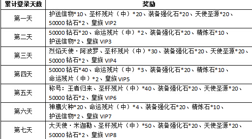 【活动内容】开服之后,玩家每日登录都可领取丰富的奖励,直至累计登录7天,共可领取7次奖励