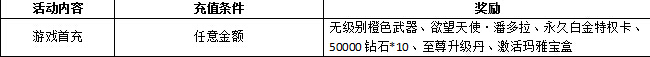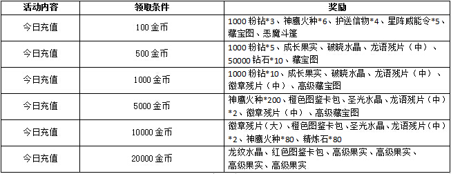 【活动内容】活动期间角色充值任意金额即可激活今日充值活动,充值达到一定额度即可领取大量奖励