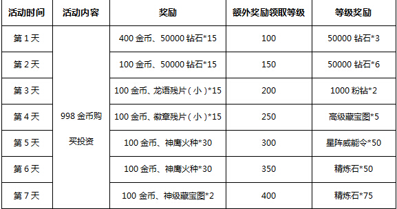 【活动内容】:花费998金币投资,100%返还加送更多奖励!