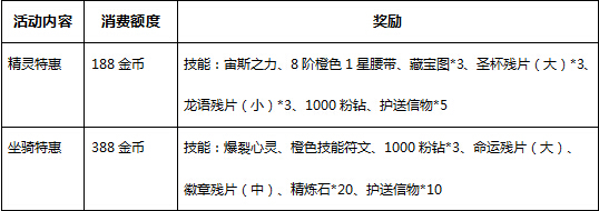 【活动内容】活动期间角色充值购买精灵特惠后即可激活坐骑特惠,领取超值大礼和绝版技能。