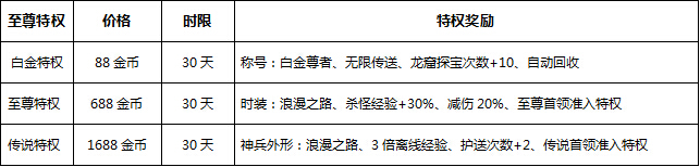 【活动内容】玩家在游戏中购买特权权益,可享受无限传送,额外活动次数,杀怪经验增益,特权首领等功能,让您杀怪,跑环不用等待,大大提高效率,并有酷炫时装等你来领。