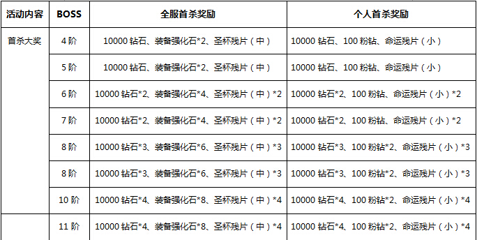 【活动内容】活动期间每个首领第一次被玩家击败后,全服玩家均可领取全服首杀奖励,当玩家个人获得一次首领归属后,还可领取个人首杀奖励