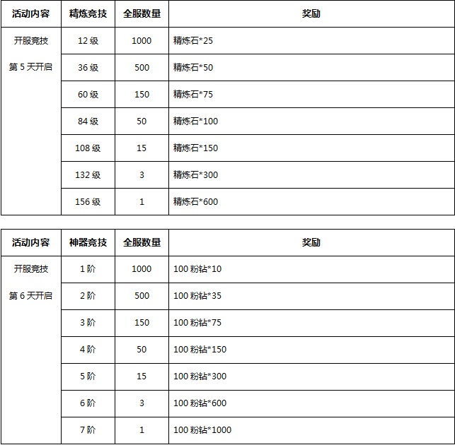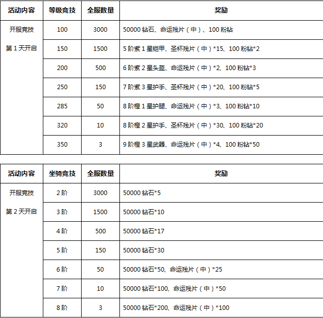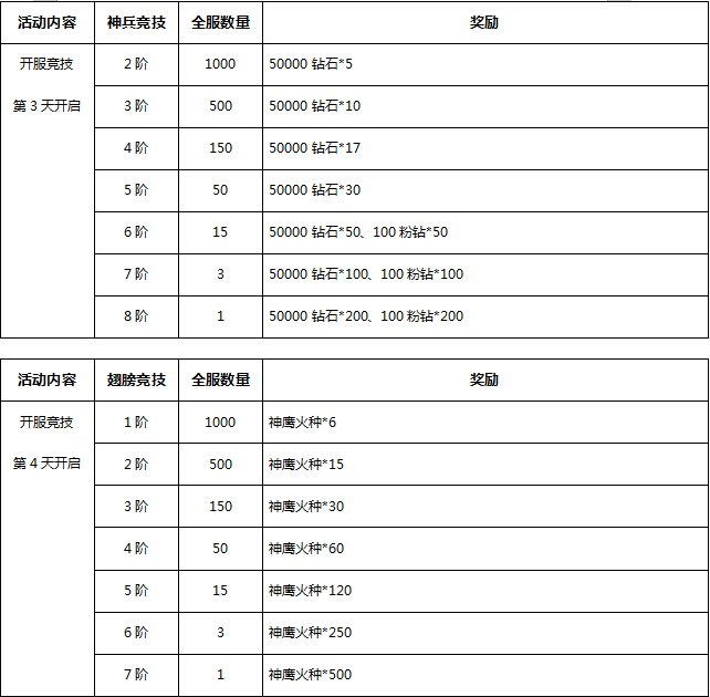 【活动内容】活动期间当玩家等级、坐骑,神兵等到达一定阶数时,可获得相应奖励,奖励数量有限,先到先得。