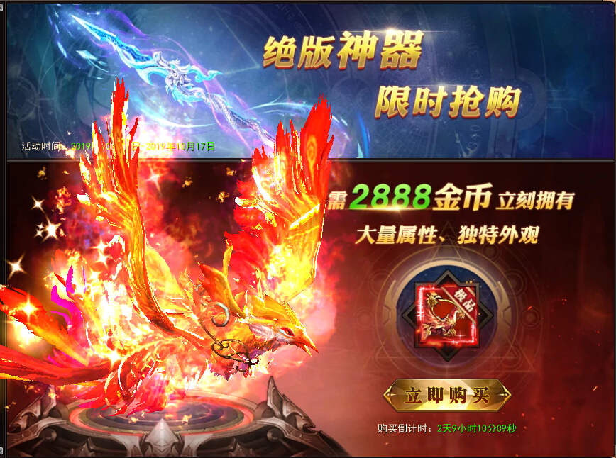 2888金币价格和神器加成的属性相比,性价比非常的高。凤凰申请越早购买是越划算的,高玩玩家建议活动出来后第一时间购买。