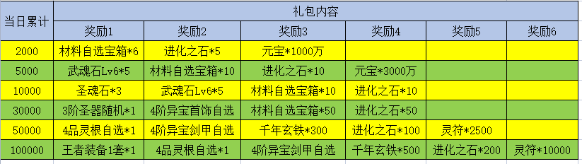 备注:当日累计取最高档发放,只发放一档奖励,道具隔天申请,如玩家5号充值10000,可以申请10000档位道具,不能同时申请5000。