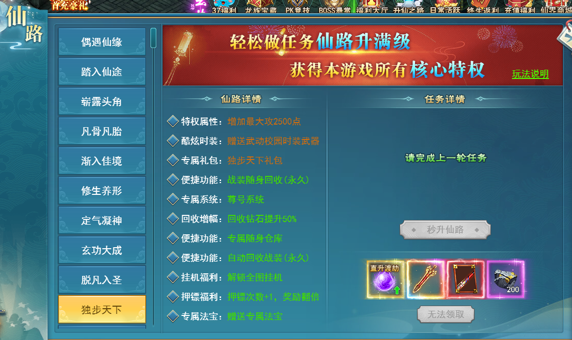 1、每级仙路都有4个特权任务,完成任务后可到达当前仙路级别,并开启下一仙路级别任务。 2、完成仙路4个任务即可领取仙路大礼包 3、渐入佳境开始有秒升仙路功能,花费一定龙晶即可购买秒升礼包与秒升仙路等级。 4、秒升仙路只能用于下一级仙路,不满足条件时将不可使用秒升仙路功能。 5、使用秒升仙路提升仙路等级仅完成任务,不会额外提升境界,系统等级等。